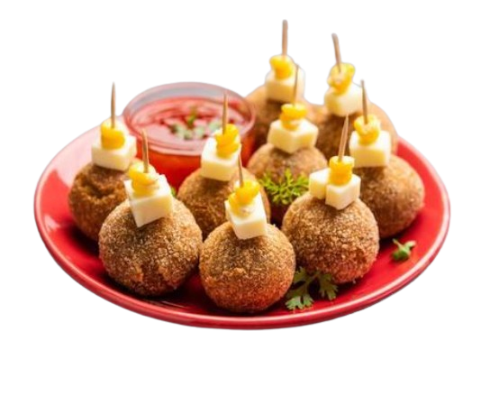 Golden spheres with a crispy coating and a creamy, cheesy interior speckled with sweet corn. They’re rich, indulgent, and ooze cheese when broken, served on a plate with a fresh parsley garnish.
