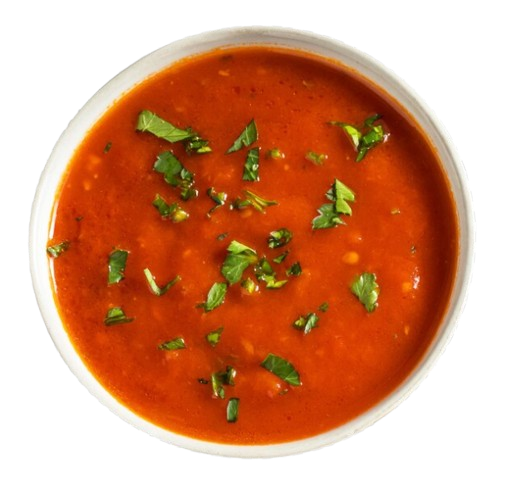 A deep red, clear tomato broth with hints of cumin and coriander floating on top. Tangy, slightly spicy, and steaming hot, served in a simple white bowl that makes the color shine.